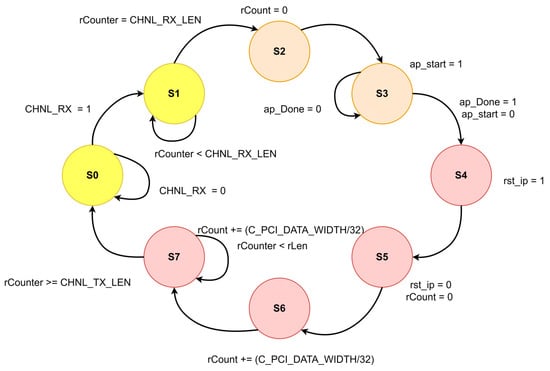 The receiving of data starts at state 0, waiting for the signal “CHNL_RX”. Subsequently, state 1 collects the data and counts the number of received words, taking into consideration the signal “CHNL_RX_DATA_VALID”. If the count is equal to “CHNL_RX_LEN”, it continues to the next stage (processing). The data processing begins with a counter reset “rCount = 0”, which occurs in state 2. Following that, state 3 asserts “ap_start” to indicate the start of the IP and waits for the assertion “ap_done”, which indicates that the IP finished its work (e.g., data reordering or matrix transpose). Data sending starts at state 4 with the reset of the IP via assertion “rst_ip”. State 5 sets “rst_ip” to zero and initializes “rCount”. Next, state 6 loads “rCount” with the number of data integers, making use of signal “C_PCI_DATA_WIDTH”. Recall that an integer is a data type with a width of 32 bits. Finally, at state 7, RIFFA is instructed to send the data from the FPGA to the CPU through the signal “CHNL_TX_LEN”. After this, the finite state machine goes to state 0 and waits for the next data to be sent.