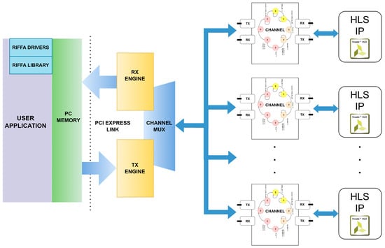 Figure 4 provides a visual representation of the integration of HLS IPs with RIFFA by means of channels. Observe how the various components work together to enable efficient data transfer and processing.