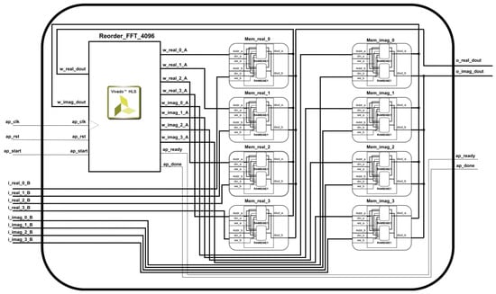 Additionally, HLS offers several optimizations, including pipeline, cyclic partition, and unroll techniques, which can further enhance the performance of the FPGA-based SAR processing routines. These optimizations contribute to improved efficiency and resource utilization, allowing for better utilization of the FPGA’s capabilities. E.g., the FFT could be implemented with the radix-8 algorithm, and instead of using eight memories as shown in Figure 6, sixteen memories would be used, and eight data sets would be processed at a time instead of four.