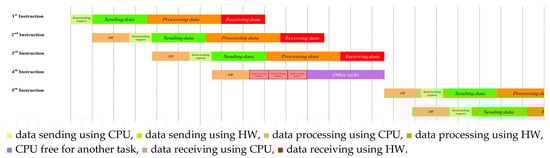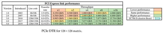 In general, FPGA-based accelerators provide problem-specific processing solutions that are highly parallelized and reliable. Moreover, there is a wide variety of devices to select from, according to the application requirements. Nonetheless, as discussed previously, there are some concerns regarding the implementation, including a long development time and a low Data Transfer Rate (DTR). However, these issues can be solved effectively by making use of tools like High-Level Synthesis (HLS) [], employed to reduce development time between fivefold and tenfold [,], and Reusable Integration Framework for FPGA Accelerators (RIFFA) [], utilized to develop a Peripheral Component Interconnect express (PCIe) interface. On the one hand, HLS allows describing Hardware (HW) via high-level programming languages (e.g., C/C++, System C, or OpenCL). Additionally, HLS permits applying optimizations like pipeline, cyclic partition, and unroll. On the other hand, RIFFA provides a framework that works directly with the PCIe endpoint, achieving high data transfer speeds (up to 15.7 GB/s for PCIe 3.0 with 16 lanes). RIFFA runs on Windows and Linux with the programming languages C, C++, Python, MATLAB, and Java [].