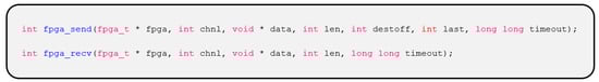 The function fpga_send sends a len of data through the FPGA channel chnl using the fpga_t structure. The values destoff and last are also sent; destoff is used to support the distribution of data across multiple send transactions, whereas last indicates whether the data transfers are finished or not. When last equals 1, the channel interprets the end of the transaction. Conversely, when last equals 0, the channel stands by for additional transactions. Finally, when timeout is equal to zero, communication is blocked indefinitely. Multiple threads sending data through the same channel may result in corrupt data or errors. Accordingly, fpga_send returns the actual number of words sent. Function fpga_recv applies the same principles as fpga_send, with the difference that it receives data from the FPGA channel chnl in the data pointer.
