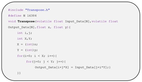 Next, to demonstrate flexibility, the VEC-FFT reordering IP is replaced by an IP for matrix transposition, another computationally expensive process due to memory latency. The matrix transpose is implemented for squared matrices with dimensions of 32 × 32, 64 × 64, and 128 × 128. The addressed CPU implementation utilizes 10,424, 38,505, and 210,928 clock cycles, respectively; conversely, the HW implementation, using the proposed methodology, reduces the number of clock cycles to 1041, 4113, and 16,401, correspondingly.