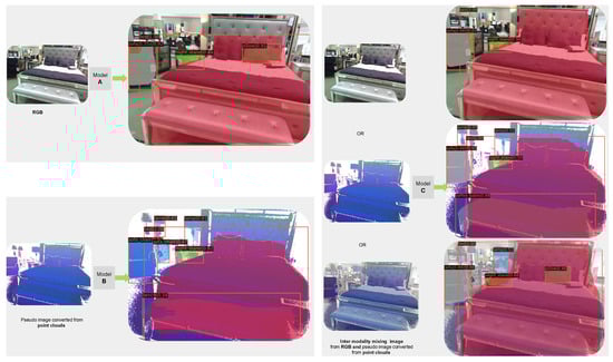 We conducted experiments that resulted in insightful observations and achieved state-of-the-art performance in 2D object detection. Our proposed unified model, named the Unified Object Detector for Different Modalities (UODDM), is capable of processing various types of images, including RGB images, pseudo images converted from point clouds, and inter-modality mixing of RGB images and pseudo images converted from point clouds. Figure 1 illustrates the differences between our model and other works. Furthermore, the performance comparison of different methods can be found in the “Results on the SUN RGB-D Dataset” session. Visualizations of UODDM outputs are presented in Figure 2. More samples can be found in our demo video accessed on 31 May 2023 https://youtu.be/PuRQCLLSUDI.