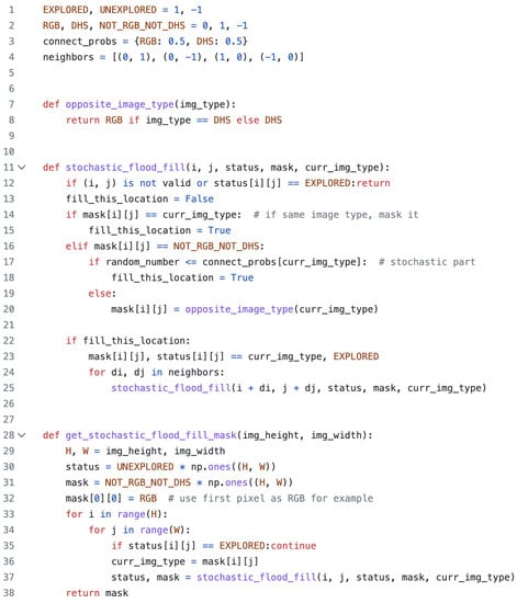 The Stochastic Flood Fill Mixing technique is an adaptation of the flood fill algorithm [36]. The approach involves establishing connections between neighboring pixels with a probability p, with separate probabilities for the RGB and DHS modalities. The algorithm can be implemented using four or eight neighbors to build the graph, with the latter including additional diagonal offsets. In our experiments, we used the four neighbor approach. The Python-style pseudocode for this algorithm is illustrated in Figure 5, while examples of SFFM are shown on the right side of Figure 4.