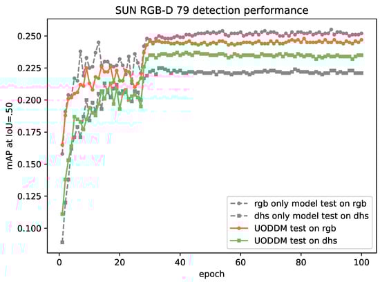 The performance evaluation of our proposed UODDM approach, measured in terms of mean average precision (mAP50), on the SUNRGBD79 dataset is presented in Figure 6. The results show that the UODDM model performs exceptionally well on both RGB and DHS images. Additionally, it is evident that the UODDM model significantly outperforms the DHS-only model in terms of performance on DHS images, which can be attributed to the inter-modality transfer learning from the RGB images. However, this performance improvement on DHS images comes at the slight cost of a performance reduction on RGB images. Nevertheless, the UODDM model’s overall performance is promising as it is a single model that can handle different modalities, making it more efficient than maintaining two separate architectures or a single architecture with two different sets of weights. This efficiency is particularly valuable for robotics and edge devices, where a seamless perception system can be built, even when transitioning from daytime to nighttime scenarios. Table 1 provides additional results for our UODDM and single-modality models, reinforcing the same conclusions.