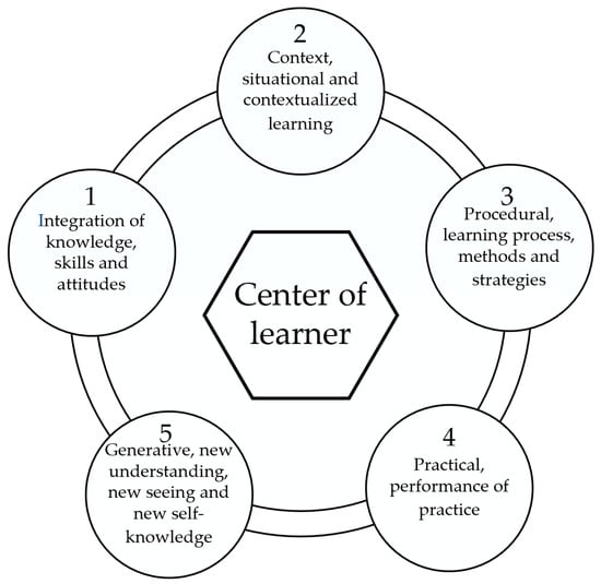 In Chen’s opinion (2018), competence-oriented curriculum and instruction put forward five key points centered around the learner. The first circle is integration, which states that curriculum and teaching must integrate knowledge, attitudes and skills; the second circle is context, which emphasizes that curriculum and teaching need situational and contextualized learning; the third circle is procedural, in which teaching emphasizes the learning process, methods and strategies; the fourth circle is practical, which states that learning performance must be practiced; and the fifth circle is generative, which stands for the learning of any knowledge. No matter through contextualization, process, or practical practice, it is ultimately necessary to return to the learner’s own integration to generate new knowledge, new seeing and new self-knowledge [], as shown in Figure 1.