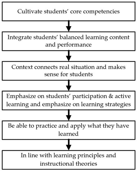 Regarding competencies-oriented instruction, it is emphasized that competencies-oriented instruction has no fixed model and is not fixed in one model. It is an instruction that summarizes principles from its meaning. Therefore, Wang (2021) integrated the principles of competencies-oriented instruction, as shown in Figure 2 [].
