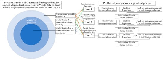 The design of the Inquiry Practical Curriculum integrated Vygotsky’s scaffolding theories as basic architecture with layered supporting brackets to include situational learning topics in which the situational simulation of real skills was built through virtual reality. Then, students learn by joining the situation and independently exploring the simulation environment of virtual reality as well as through the recording and analyzing of peers about the participants’ situational and virtual environment in order to reach the target of cooperative and negotiating learning with peers. These kinds of instructional strategies not only make students able to use scaffolding methods to develop cross-science and creative learning directions but also improve their learning effectiveness as well as learning motivation []. There are various models for scaffolding methods. Reigosa indicated that scaffolding support makes it easier for teachers, students and peers to learn and investigate through the ZPD (zone of proximal development) in which students could complete the missions through teachers’ supporting tools to find solutions to the problems they are able to or are not able to solve []. Therefore, this study used the conceptual model of ZPD to a design a strategy model that meets the study’s requirement of virtual reality presenting in Vehicle Body Electrical System Comprehensive Maintenance and Repair Services Practice practical capability investigation, as shown in Figure 3. The abbreviation of the zone of proximal development is ZPD in this study and the modeling concepts were used to input virtual reality as a supporting tool and then to use investigation practice as guidance for students to actively investigate situational problems and at the same time to cultivate their systematic thinking, problem-solving, and self-directed learning capabilities. In this model, orange lines and green lines focus on supporting learning through virtual reality, and meanwhile, the difficulty levels were added in three periods so that students could observe the problems in the practical curriculum first and then correctly assume and find the solutions to the fault causes through maintenance and repair and ways of detection.