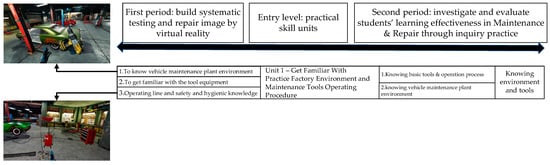 - In the first period, the virtual reality-assisted building system was considered as the goal in which the curriculum instruction was conducted at the entry level in “Unit 1—Get Familiar With Practice Factory Environment and Maintenance Tools Operating Procedure” with the issues of factory environment safety and hygienic knowledge. In the second period, the testing of practical evidence and students’ learning effectiveness in maintenance and repair were considered as the goal in order to verify and test students’ practical learning effectiveness in basic tools and equipment and their operation processes in vehicle maintenance plants.