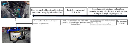 - At the basic level, the virtual reality-assisted building system was considered as the goal in which the curriculum instruction was conducted in the first period in “Unit 2—Disassembly and Functional Testing of the Automotive Alternator and Starting Motor”. The curriculum was designed for students to become familiar with virtual reality components disassembly processes and choosing tools and equipment. In the second period, the testing of practical evidence and students’ learning effectiveness in maintenance and repair were considered as the goal in order to verify and test students’ application in familiarity with testing and diagnostic tools and their learning effectiveness in vehicle maintenance and the disassembly of an automotive alternator and starting motor.