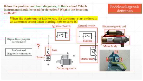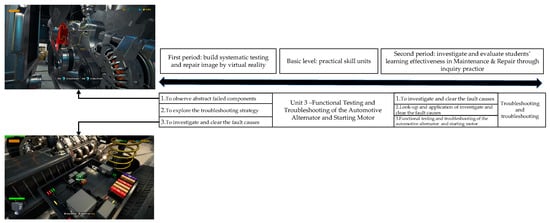 - At an advanced level, the virtual reality-assisted building system was considered as the goal in which the curriculum instruction was conducted in “Unit 3—Functional Testing and Troubleshooting of the Automotive Alternator and Starting Motor” in order to help students’ observations of abstract failed components and explore students’ troubleshooting strategies and investigation in fault clearing. In the second period, the testing of practical evidence and students’ learning effectiveness in maintenance and repair were considered as the goal in order to verify and test students’ operation capabilities in fault causes and troubleshooting, to evaluate students’ application process in looking up maintenance manuals and eventually to verify their learning effectiveness in automatic maintenance and fault clearing.