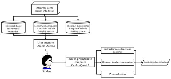 In this study, games missions designed for Vehicle Body Electrical System Comprehensive Maintenance and Repair Services Practice were considered instructional environments. Three different sets of scenes and missions were designed for grouped students to practice their skills in fault causes diagnosis and troubleshooting, and the system architecture is shown in Figure 7. First, the projection of the visual scenes was shown on the computer screen. Then, secondly, the instructor helped and assisted students with mission completion. Finally, lesson-observation teachers and peers helped record the interaction situation between the instructor and the students. The record is aimed at evaluating how instructors and peers helped solve problems and complete missions in VR games.