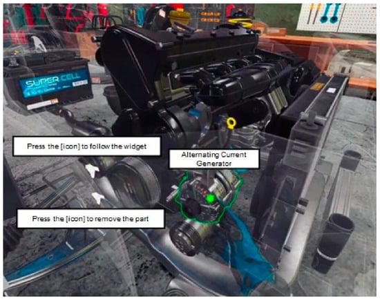 - Advanced Level: In “Functional Testing and Troubleshooting of the Automotive Alternator Starting Motor”, virtual reality assisted students with observing abstract failed components to explore the troubleshooting strategy and then investigate and clear the fault causes, in which students’ practical skills helped them quickly understand the fault causes and reach the target of their learning effectiveness in functional testing and troubleshooting by using the maintenance manual and applying diagnostic tools, which is shown in Figure 6.Figure 6. Unit 3: Virtual reality that integrates into automatic maintenance and fault clearing.