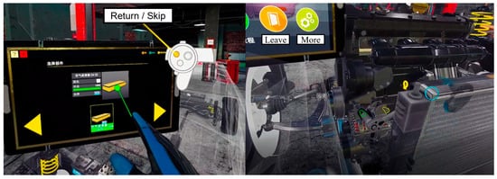 Before the game simulation, the instructor recorded the VR game scenes and provided students with VR equipment and operative examples in order to help those students who first use VR to know and become more familiar with the VR system operation and its environment and to make it easier for students to be more proficient with VR equipment and adapt to it. Oculus Quest 2 equipment functions include microphones and sound systems, in which the voice output provides students with immersive experiences in VR game scenes. Students could operate the VR handles to control the location and direction in the VR game environment and also to use the maintenance tools or other components through VR handles. This study used a series of VR equipment for students to simulate the scenes of vehicle maintenance plant and complete the missions. The practice scenes are shown in Figure 8. Students were able to give feedback to lesson-observation teachers many times in the experimental instruction process when they felt dizzy or disoriented, and they could take off the VR equipment if they felt uncomfortable.