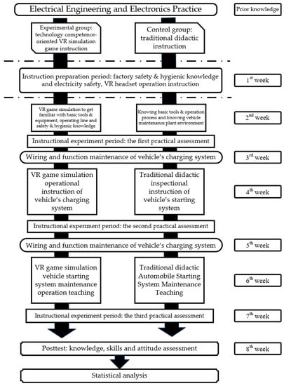 This study uses a quasi-experimental design in which the students’ academic performance in the Vehicle Body Electrical System Comprehensive Maintenance and Repair Services practical subject is measured by their pretest scores. In addition, the instruction environment control was conducted before the instruction experiment in which the control variables were students’ grades, instructors, instruction hours, students’ degrees, instruction content and evaluation. The instructional experiment progress was conducted for 8 weeks (four hours each week), and there were a total of 32 instruction hours, including the instructional preparation week, assessment week and the final-examination week. The instruction experimental design is shown in Table 2, and the instruction experiment progress is shown in Figure 10.