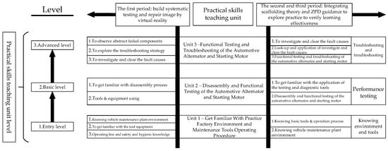 Through the strategy model of inquiry practice capability mentioned above, scaffolding and level learning were integrated into the following three units of Vehicle Body Electrical System Comprehensive Maintenance and Repair Services Practice for the inquiry practice instruction. The three units are (1) Basic Instrumental Operation, (2) Vehicle Charging System Maintenance and Repair Services, and (3) Vehicle Starting System Maintenance and Repair Services, which were planned and divided into three levels (entry level, basic level, and advanced level) and redefined into the following new unit names: (1) Unit 1—Get Familiar With Practice Factory Environment and Maintenance Tools Operating Procedure, (2) Unit 2—Disassembly and Functional Testing of the Automotive Alternator and Starting Motor, and (3) Unit 3—Functional Testing and Troubleshooting of the Automotive Alternator and Starting Motor. In this study, systematic testing and repair images built in virtual reality were used to comply with learning key points of curriculum units in order to meet the target of learning effectiveness through practical verification. The relationship of practical skills instruction among the three different units is explained as follows.