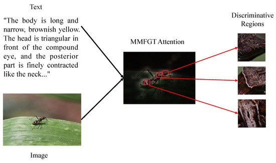 To address the problem that existing methods require large datasets and do not exploit the semantic associations between multimodal data, this paper proposes a multimodal fine-grained transformer (MMFGT) model for pest recognition. The MMFGT extends the transformer structure with self-supervised learning and fine-grained recognition methods. In particular, it extracts target features using self-supervised learning to improve recognition accuracy and reduce the reliance on data volume, while focusing attention on subdivision regions of pest images, overcoming the challenge represented by pest images with low proportions of pest targets, which are difficult to identify accurately. As shown in Figure 1, the MMFGT method can improve the accuracy of fine-grained pest recognition by focusing attention on the subdivided regions of the head, thorax, and tail in the pest image. In addition, the MMFGT further improves the performance of fine-grained pest recognition by exploiting the joint multimodal information from images and natural language descriptions of pests. Experimental results showed that the MMFGT achieved more competitive results compared to several advanced image recognition methods in the pest recognition task, with a recognition accuracy of up to 98.12%.