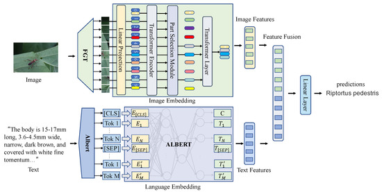 In this paper, a fine-grained pest recognition model (MMFGT) is proposed to solve the few-shot pest recognition problem. The architecture is shown in Figure 2. At the beginning, the image is segmented into small pieces and projected into the embedding space. The input to the transformer encoder includes the patch embedding, as well as the learnable position embedding. Before the last transformer layer, a part selection module (PSM) is applied to select the tokens corresponding to the discriminative image patches, and only these selected tokens are used as input for the last transformer layer to finally obtain the features of the image. The description text corresponding to the image is fed to the text encoder (ALBERT [35]), and the input is transformed into feature vectors as text features after a multi-layer transformer. Finally, the image features and text features are linearly stitched together for linear classification to obtain the predicted class of pests.