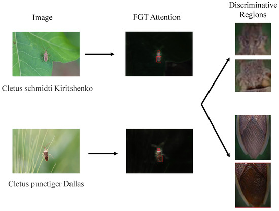 By connecting the categorical tokens corresponding to information regions to the last transformer layer instead of the original, entire input sequence as input, the architecture not only preserves the global information but also forces the last transformer layer to focus on the subtle differences between different subcategories and ignore less discriminative regions, such as background or common features. Figure 4 shows the difference images of the pests captured with the FGT method.