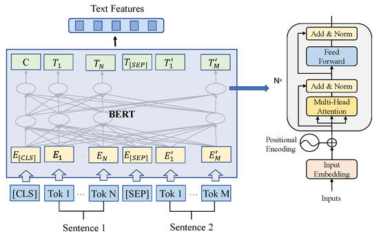 The mainstream text encoders are BERT [37], ALBERT [35], etc. As shown in Figure 5, BERT is a deep bi-directional language representation model capable of incorporating contextual information. The input of BERT is the representation corresponding to each token, denoted as E. The representation consists of token embeddings, segment embeddings, and position embeddings. The word dictionary is constructed using the WordPiece algorithm. To accomplish the specific classification task, in addition to the word token, each sequence of the input has a specific classification token at the beginning, and the output of the last transformer layer corresponding to this classification token plays the role of aggregating the information of the whole sequence representation. Each sentence is followed by a split token to separate the different sentence tokens. After the multilayer transformer, C is the output of the classification token corresponding to the last transformer, and represents the output of the ith input token corresponding to the last transformer. The input text goes through the BERT model and is transformed into feature vectors.