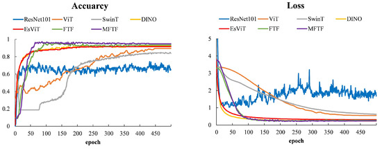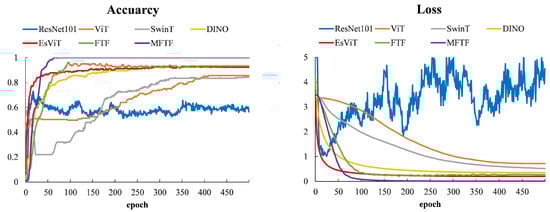 In addition, validation was performed with the remaining 14-class pest datasets (containing 611 images) in the IDADP dataset, without the stinkbug dataset. The performances of the different models with the validation set for the rest of the IDADP datasets are shown in Table 6. The accuracy curves and loss curves for the different pest recognition models with the remaining class-validation IDADP sets are shown in Figure 8. It can be seen that, due to the low similarity between the remaining class datasets (excluding the stinkbug dataset), the large differences in pest characteristics, and the small number of datasets, the recognition accuracy of the MMFGT model was high, achieving 100% for accuracy, precision, recall and F1 score. Specifically, the accuracy of the MMFGT model was 3.87% better than the FGT method, 7.18% better than EsViT, 7.73% better than DINO, 15.53% better than SwinT, 14.36% better than the ViT method, and 27.07% better than ResNet101. From the experimental results for the stinkbug dataset and the rest of the datasets, it can be seen that the MMFGT model still showed the best performance with smaller and more similar datasets in comparison to the advanced baseline.
