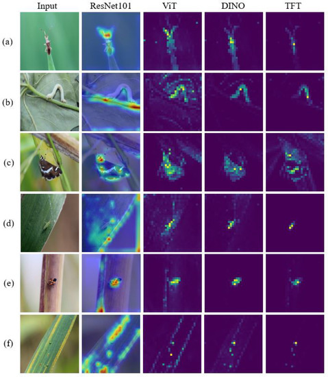 To further explain the role of each module of the FGT model, several IDADP pest images were visualized, and the visualization results of the different methods are shown in Figure 10. The importance of each region is represented by the color from low to high with blue, green, yellow, and red. As can be seen from Figure 10a–e, the ResNet101 model could not accurately focus on the pest images and the attention images were scattered. The ViT model could focus roughly on the pest image due to the attention mechanism, while DINO could focus more precisely on the pest image compared to the ViT model due to the self-supervision mechanism, and the FGT model could better focus on the head, thorax, and tail of the pests compared to DINO due to the fine-grained mechanism. However, for cases where the proportion of pests in the image was too small and the pests were very close to the background, such as in Figure 10f, the FGT method and the existing Resnet, ViT, and DINO methods were disturbed by the background and could not accurately identify the image, thus reducing the recognition accuracy. In summary, the FGT method could generally improve recognition accuracy by accurately focusing attention on pest-image subdivision regions through the fusion of the attention mechanism, self-supervision mechanism, and fine-grained mechanism, but for cases where the pest target is not obvious, recognition accuracy still needs to be improved.