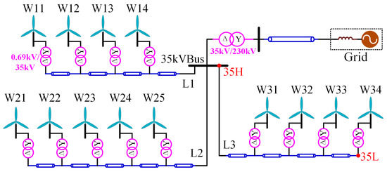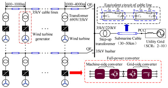The topology of the studied offshore wind farm is shown in Figure 1; it mainly includes a WTG, 35 kV centralized power grid, station step-up transformer, and 220 kV transmission submarine cable. The wind turbine is composed of a wind turbine, generator, converter, and generator end transformer. The converter adopts the traditional two-level topology, and the grid-side converter adopts an LC filter. The wind turbines are connected by 35 kV submarine cables to form several feeders, which are connected to the 35 kV convergence bus. After boosting, they are sent out for grid connection through 220 kV AC cables.