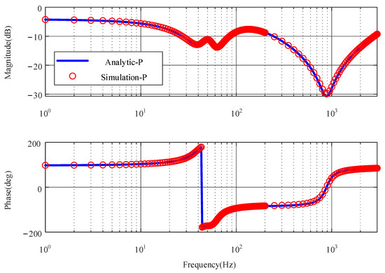 In Figure 3, the blue curve represents the theoretical impedance and the red circle represents the measured impedance of WTG. It can be seen that the two impedance waves are highly consistent with each other, so Equation (14) can be used to characterize the impedance characteristics of WTG. It also can be seen from Figure 3 that the impedance of WTG is negative resistance inductance below 50 Hz. Between 50 Hz and 200 Hz, the impedance of the grid-side converter shows negative resistance capacitance characteristics. Between 200 Hz and 900 Hz, the impedance of the grid-side converter shows positive resistance capacitance characteristics. Above 900 Hz, the impedance of the grid-side converter is mainly positive resistance inductance. Among them, the impedance of the grid-side converter drops sharply at 900 Hz, and its value is 10−(30/20) = 0.0316. The main reason is that this is the natural resonant frequency of the converter LCL filter.