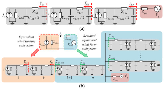 In order to analyze the high-frequency resonance problem at any position in the complex wind farm system, as shown in Figure 1, the wind farm was divided into an equivalent wind turbine group subsystem and a remaining equivalent wind farm subsystem by taking the k-th wind turbine of the i-th feeder as the dividing point, as shown in Figure 7b. Similarly, the calculation method of the residual equivalent wind field subsystem impedance can be obtained using the iterative method: