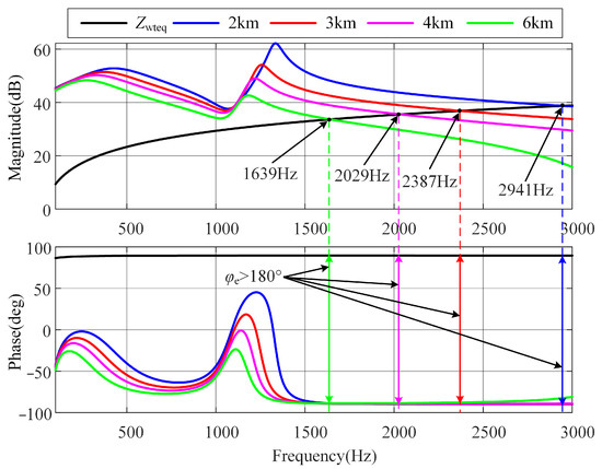 Figure 16 shows a schematic diagram of the impedance of the wind turbine GCC and the grid impedance before and after considering the cable capacitance effect. The cable length is considered to be 8 km, the delay time is considered to be 300 μs, and the current loop control parameters are taken as Kp = 0.1 and Ki = 15.7. As shown in Figure 16, when the cable capacitance effect is not considered, there is no intersection between the converter impedance and the grid impedance, and there is no oscillation frequency point in the system. If the cable capacitance effect is considered, there are points of intersection between the GCC impedance and the grid impedance at 1.1 kHz and 1.5 kHz, and the phase angle difference is φea > 180° and φeb < 180°. According to impedance stability theory, there is a risk of oscillation in the system at this frequency point of 1.1 kHz.
