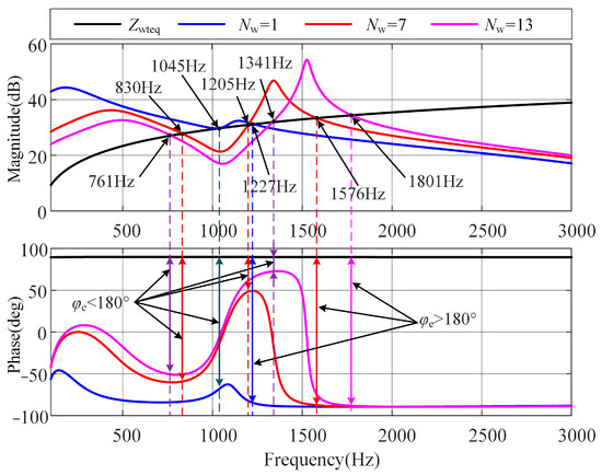 - Compared with Figure 12, the resonant peak frequency of the remaining equivalent wind farm subsystem impedance moves to the low-frequency band with the increase in the number of wind turbine links connected to the 35 kV convergence bus;