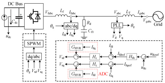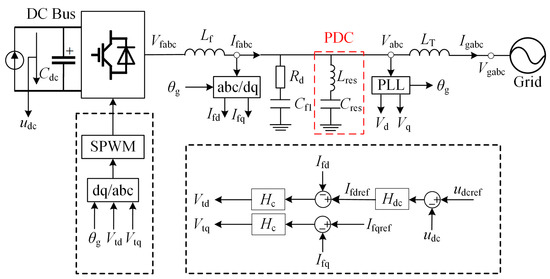 Figure 2 shows the typical control block diagram of GCC, in which Lf and Cf1 are the filter inductance and filter capacitor of the converter, respectively; Rd is the damping resistance; Vfabc and Ifabc are the output voltage and current of the converter, respectively; Vabc is the point of common coupling (PCC) voltage; Vgabc and Igabc are the port voltage and current of 690 V side, respectively; Cdc is the DC capacitance; udc is the DC bus voltage; and the subscript dq represents the variable in the dq coordinate system.