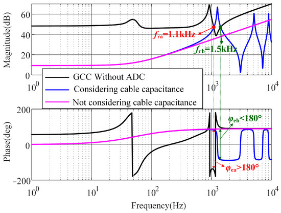 The impedance intersections of GCC without ADC and grid impedance are at 1.1 kHz and 1.5 kHz, and the phase angle difference φea1 exceeds 180°; φeb2 is within 180° at the intersection. There is an evident resonance problem at 1.1 kHz. However, with the ADC, the impedance intersections of GCC and grid impedance are at 700 Hz, 1 kHz, and 1.45 kHz, and the phase angle differences φea2, φeb2, and φec at the intersection are all within 180°. There is no resonance problem in the system. In addition, as shown in Figure 17, the resonance frequency point of the system was eliminated at 1.1 kHz, and the stability margin of the system was greatly improved at 1.1 kHz, which can effectively suppress the resonance of the system current.