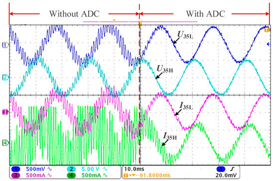 Experimental conditions: The length of the cable line was 8 km, the control delay of the GCC was 300 μs, and the current loop parameters were Kp = 0.1 and Ki = 15.7. Through impedance analysis, the resonance frequency of the system was found to be about 1.09 kHz. Figure 20 shows the effect of the ADC method, and Figure 21 and Figure 22 show the experimental results before and after the ADC method was put into use.