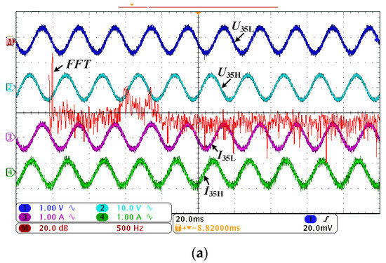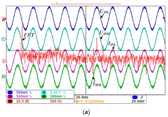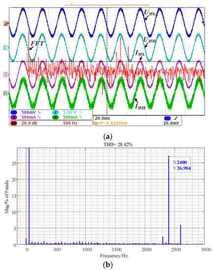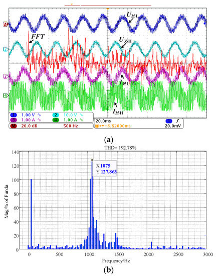 Experimental waveform without ADC of GCC: (a) Voltage and current waveforms of 35 kV cables; (b) current harmonic distortion of terminal 35 kV cable.