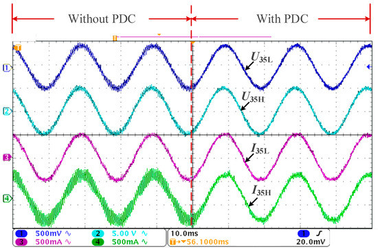 Experimental conditions: The length of the cable line was 3 km, and the other conditions remained unchanged. Through the impedance analysis, it can be concluded that the resonant frequency of the system is about 2.4 kHz, which exceeds the control bandwidth of the GCC. The ADC method is limited and can only be used to suppress current resonance. Figure 23 shows the effect of the PDC method, and Figure 24 and Figure 25 show the experimental results before and after the PDC method was put into use.