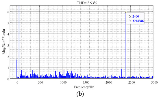 Comparing Figure 24 and Figure 25, it can be seen that, before the PDC was put into operation, the harmonic content of the current at the end of the 35 kV cable was as high as 28.42%. After the PDC was put into operation, the harmonic content of the current at the end of the 35 kV cable decreased to 8.93%, and the current harmonic phenomenon was significantly suppressed, verifying the effectiveness of the PDC strategy.