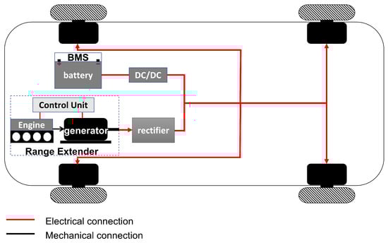 This article takes a four-wheel drive bus powered by a range extender and a battery as the research object; the engine and generator are mechanically connected to form the range extender. A DC/DC converter connects the battery and other power components, and the automotive structure used in this article is shown in Figure 1. The parameters of each major component are shown in Table 1.