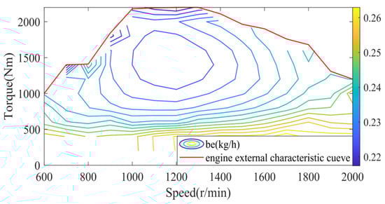 where represents the engine fuel consumption rate, kg/h; is the engine torque, Nm; represents the speed, r/min; and represents the equivalent fuel consumption rate, kg/KWh.