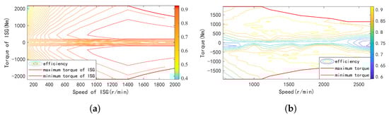 Generator and motor have similar characteristics and are used to achieve the conversion between mechanical and electrical energy. The quasi-static model of the generator and drive motor is shown in Figure 3. Because the generator and engine are mechanically connected, the optimal fuel consumption curve of the range-extender can be calculated by combining the drive generator and engine models. The optimal fuel consumption curve of the range-extender is shown in Figure 4a. The method for calculating the vehicle economy is as follows: