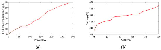 Range-extender optimal fuel consumption curve and battery open circuit voltage. (a) Range-extender optimal fuel consumption curve; (b) battery open circuit voltage.
