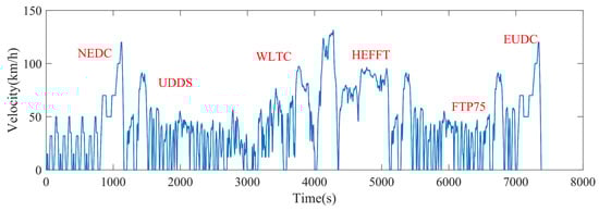 This paper first collects various vehicle signals through simulation, then conducts Pearson’s correlation analysis to select four signals with high correlation in the historical horizon, combined with vehicle speed to form the input layer data. Then, we input different signals in the historical time domain into the trained model to predict the vehicle speed. Finally, we propose a control strategy combining the MPC and ECMS to obtain adaptable equivalent factors and control quantities in the control time domain. The combination of MPC and ECMS enables real-time adjustment of the range-extender output power while facilitating short-term planning. In this section, we compare two machine learning-based prediction methods: (1) vehicle speed prediction by multi-signal LSTM; (2) vehicle speed prediction based on SVM. The test set adopts world transient vehicle cycle (WTVC), while the training set consists of six working conditions: NEDC, WLTC, UDDS, HEFET, FTP75, and EUDC. The speed changes in the training set are shown in Figure 5. The workflow of this study is shown in Figure 6.