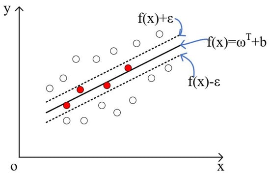In contrast to traditional regression models, SVR assumes a minimum value exists such that is greater than or equal to the absolute difference between any predicted value and the actual value y. Losses are calculated when the absolute value of exceeds , and the prediction is considered accurate when the absolute value of the difference from y is less than . Equations (8) and (9) show the expression of SVR and the loss function.