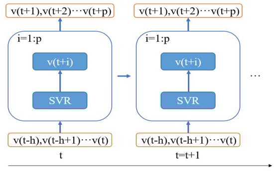 The process of using SVR to solve the vehicle speed prediction problem is shown in Figure 8.In the figure, the arrows indicate that as time changes, ’...’ indicates the sliding window cycle calculation. It adopts a rolling prediction method to advance every second, using the vehicle speed in the historical time domain h as the input for the prediction model. The model operates and outputs the predicted velocity for the following p seconds, continuously updated throughout cyclic prediction.