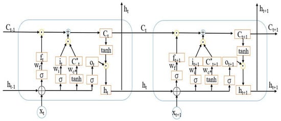 Figure 9 depicts the LSTM network configuration. The LSTM includes a unit state C compared to the RNN to save the long-term state. The input of an LSTM consists of three components: , , and . Here, represents the current input value, while and represent the output and state values from the previous time step, respectively. Two outputs are obtained through computation: the current output value and the unit state . Unlike traditional RNNs, LSTM uses three gates—input, output, and forget gates—to regulate the memory C. Retention of the input in is determined by the input gate, while the output gate determines how much of and is retained in . The calculation formula for each parameter in the structure diagram is shown in Equation (17):