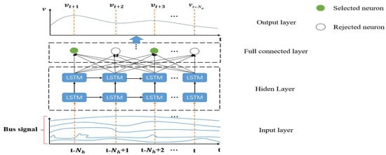 The process of predicting vehicle speed using LSTM is similar to the SVR method and is achieved through rolling prediction. As shown in Figure 10, represents the historical temporal step size. By inputting the accelerator pedal opening, brake pedal opening, motor speed, air resistance, and historical vehicle speed information into the historical time domain, the neural network can calculate the change of speed within the subsequent p seconds. Then the rolling window is used for future speed prediction. During the training process, the network not only learns different features but also learns the noise in the training set which may cause the network to perform poorly on the test set due to overfitting. Therefore, this article adds a dropout layer. After adding the dropout layer, the neural network randomly deletes nodes in the hidden layer and all connections forward and backward with a probability p, thus forming a new network structure to ensure the model’s generalization ability and prevent overfitting. This article uses a neural network with a dropout probability of 0.2, as shown in Figure 11. The green network nodes shown are the selected nodes, and the white nodes are abandoned nodes.