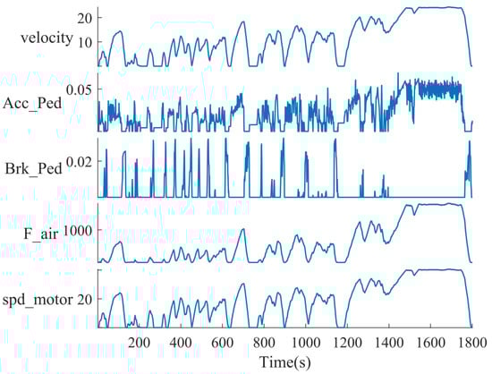 We built a vehicle model and conducted a vehicle speed prediction simulation using Matlab2022b; the computer’s CPU is Intel i7-9750H with a frequency of 2.60 GHz and 16 GB RAM. After the construction of two vehicle speed prediction models, both models were trained using the training set shown in Figure 6 and tested using the WTVC scenario as the test set. For the SVR model, only the speed with a historical time domain of 30 s was collected as prediction input. For the LSTM method, the historical vehicle speed, throttle pedal opening, brake pedal opening, and motor speed with a historical time domain of 30 s were collected for vehicle speed prediction inputs. Various vehicle signals collected from the whole vehicle model during the simulation of the training set are shown in Figure 11. When the historical time domain of both speed prediction methods was 30 s, and the prediction time domain was 5 s, the root mean square error (RMSE) of the multi-signal LSTM and SVR vehicle speed prediction methods were 3.0936 and 4.2482, respectively. The red part of the graph shows the predicted vehicle speed per second, and the black part shows the actual vehicle speed.The prediction results of the two methods are shown in Figure 12a. The performance of these two prediction methods under different prediction time domains while keeping the historical time domain at 30 s is shown in Table 3. It can be seen that the RMSE of the multi-signal LSTM speed prediction is smaller and more accurate, better reflecting the future trend of the vehicle speed. Therefore, we used the multi-signal LSTM to perform vehicle speed prediction and used the adaptive ECMS method as the energy management strategy based on the prediction. In this paper, the prediction time domain of 3, 5, and 7 s were performed to determine the most suitable prediction time domain size. The three vehicle speed prediction performances are shown in Figure 12b. We found that the larger the time domain of the prediction model, the relatively poorer the prediction accuracy. Additionally, considering the combination of energy management and vehicle speed prediction, it is not conducive to plan energy management strategies when the predicted future period is too short; therefore, 5 s was selected as the prediction time domain of the MPC framework for energy management so the MPC-ECMS could make optimal decisions.