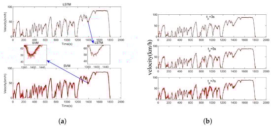 Vehicle speed prediction effect of different prediction methods. (a) Comparison of multi-signal LSTM and SVM vehicle speed prediction; (b) comparison of multi-signal LSTM vehicle speed prediction in different prediction time domains.
