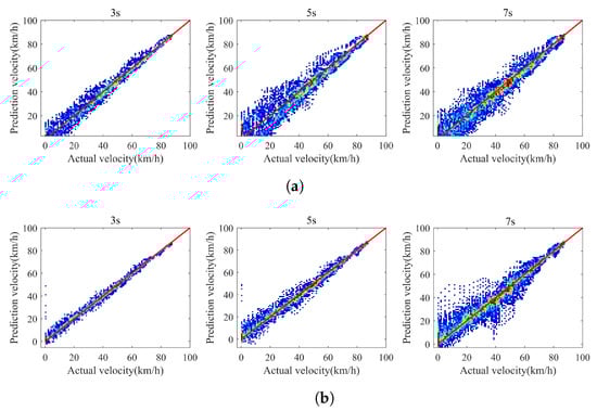 Further research on the two methods of speed prediction yielded SVM and multi-signal LSTM speed prediction heat maps, as shown in Figure 13. The experimental results show that when the prediction time was 3 and 5 s, the speed point distribution predicted by the multi-signal LSTM method is more concentrated around the true value than the SVM method and has a better predictive performance. When the prediction time was 7 s, although there are a few scattered points in the LSTM method, most of them are still concentrated around the true value. The results in Table 3 show that when the prediction time was 7 s, the predictive performance of the two methods is relatively similar.