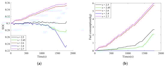 The range-extender has different working states when different equivalent factors are selected. This paper sets the reference SoC for power maintenance to 0.3. Figure 14 is the comparison diagram of SoC maintenance and vehicle fuel consumption when different equivalent factors are selected. Figure 14 shows that when the equivalent factor 2.5, the SoC change is mostly stable. As the value of s increases, the vehicle tends to use more fuel and continuously charge the battery.